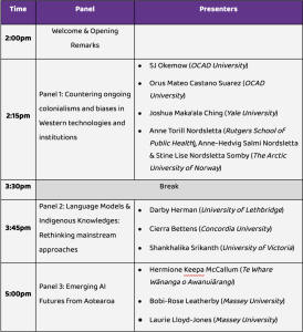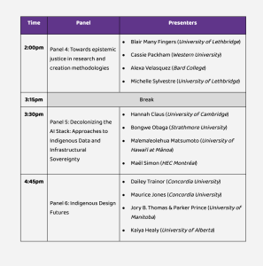 With six thematic panels spread across two days, students from around the world will share their research-creation projects and future imaginaries of AI rooted in Indigenous Knowledges, protocols, epistemologies, and arts.