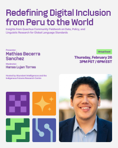 Mathias Becerra Sanchez is a student from Peru currently pursuing a major in Symbolic Systems in the Concentration of Human-Centered AI and Human-Computer Interaction at Stanford University. His work focuses on using technology to empower Indigenous and other digitally disadvantaged languages both in Peru and Latin America. In this talk, he’ll be presenting his research on STEM education, linguistics, and policy in globally disadvantaged language communities.